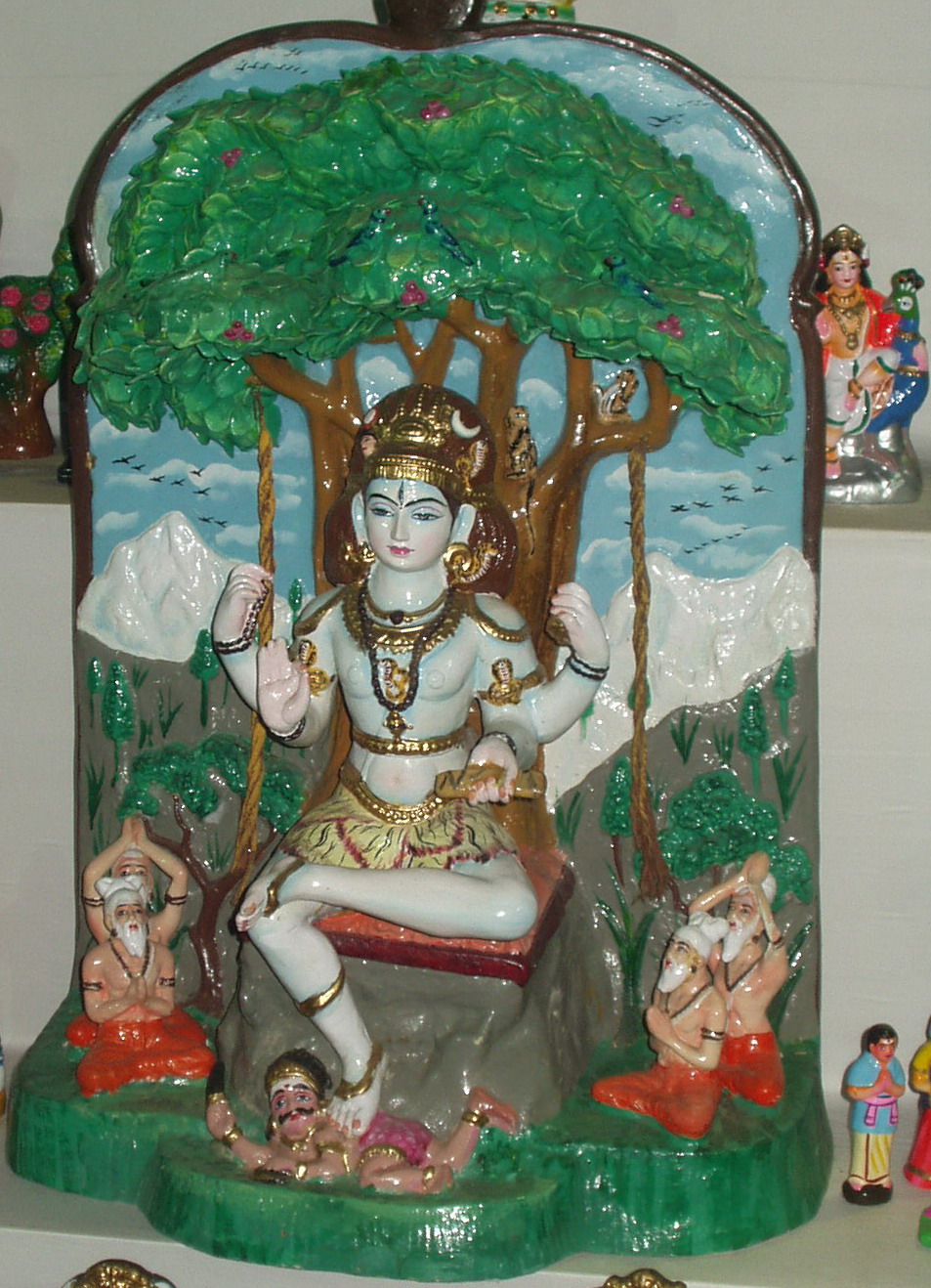 ตำนานว่า เมื่อบรรดา  ฤาษี พรหมบุตรทั้ง 4 ตน คือ สนัตกุมาร สนักกุมาร สนันทนกุมาร และสนาตนกุมาร ได้บำเพ็ญเพียรมานาน แต่ไม่รูว่าอะไรคือความจริงแท้สูงสุด ก็พากันสวดอ้อนวอนต่อพระศิวะ พระศิวะจึงทรงอวตารมาในรูปของพระทักษิณามูรติ